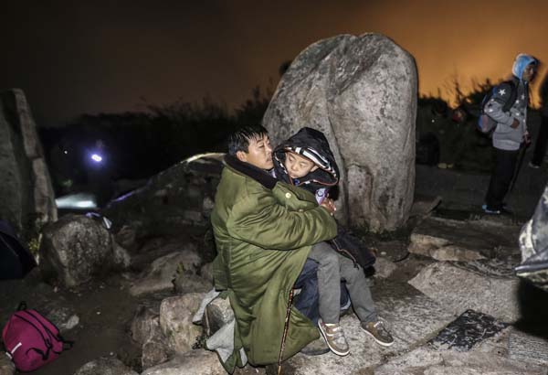 山路边,一位从河北赶来看日出的父亲裹着军大衣,抱着10岁的儿子坐在山石上休息。