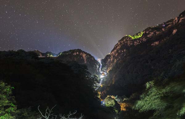 星空下,从山下往上遥看“泰山十八盘”山路几近垂直,山路上密布的点点的灯光汇成一条“天路”。