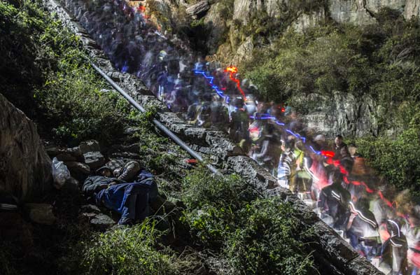 接近山顶南天门处两位游客躺在路边山石上睡着了,此时山路已经是人挨着人,需要一步一步缓慢挪动才能往前走。