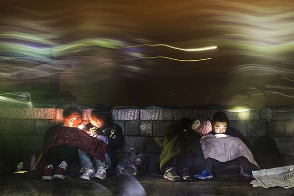 山顶南天门通往玉皇顶的道路边,疲劳的游客裹着军大衣休息。