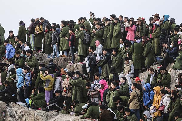 不少外地游客选择当天到达泰安后不作休息随即夜登泰山。实在忍不住倦意,便裹着30元租来的军大衣倚在山石上休息。接近“泰山十八盘”时基本已经开始人挨着人,一步一步往上挪。