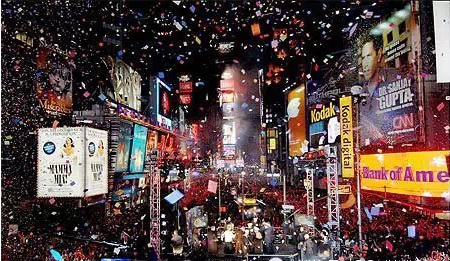 晚上11点59:进入最后的60秒倒计时,然后10,9,8,7,6,5,4,3,2,1,时代广场的水晶球落下,人们开始沸腾欢呼。