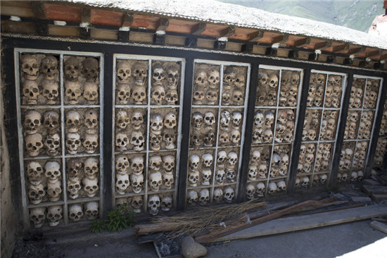 从城北行署所在地的那曲图库镇向东南走约300公里,就是比如县。达摩寺多多卡天葬台就位于比如县城西郊,也是骷髅墙所在地。整个天葬台院子约有4000多平方米,四周有约一人高的土墙,在南墙和西墙上修有木架,约四五格,每格内都整齐地排列着一个个人头骨,形成两面长长的骷髅墙,一个个威严的骷髅头骨,让人感到神圣的威慑和由衷地惊叹。在西藏,人死后尸体全部喂鹰鹫,不留一点,唯独达摩寺内的多多卡天葬台,保留了众多死者的头骨,此举堪称世界一绝。