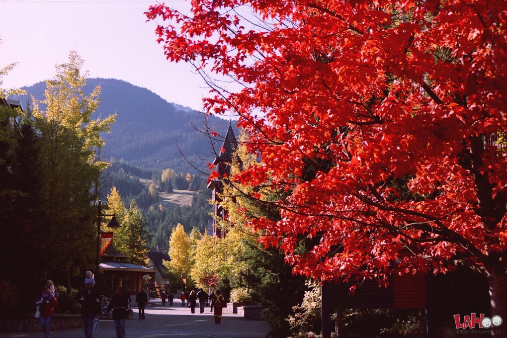 我们到Whistler时,小镇正笼罩在迷人的秋色之中,不管路旁还是山上遍布彩林,红的、黄的、绿的,把整个小镇装点的色彩缤纷,美不胜收。在灿烂的阳光下,折射出熠熠红光,耀眼的金黄,各种植物在大自然中显露出自己最美的色彩,再加上蓝天、白云、碧水等等,如画的色彩幻化成秋韵的乐章,不由得让人陶醉。