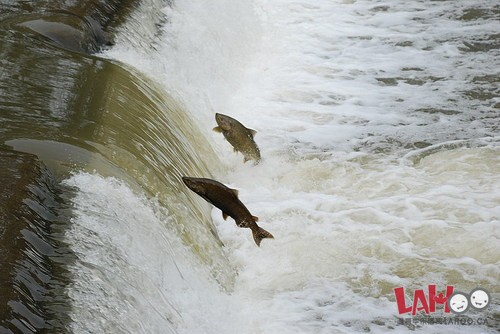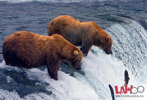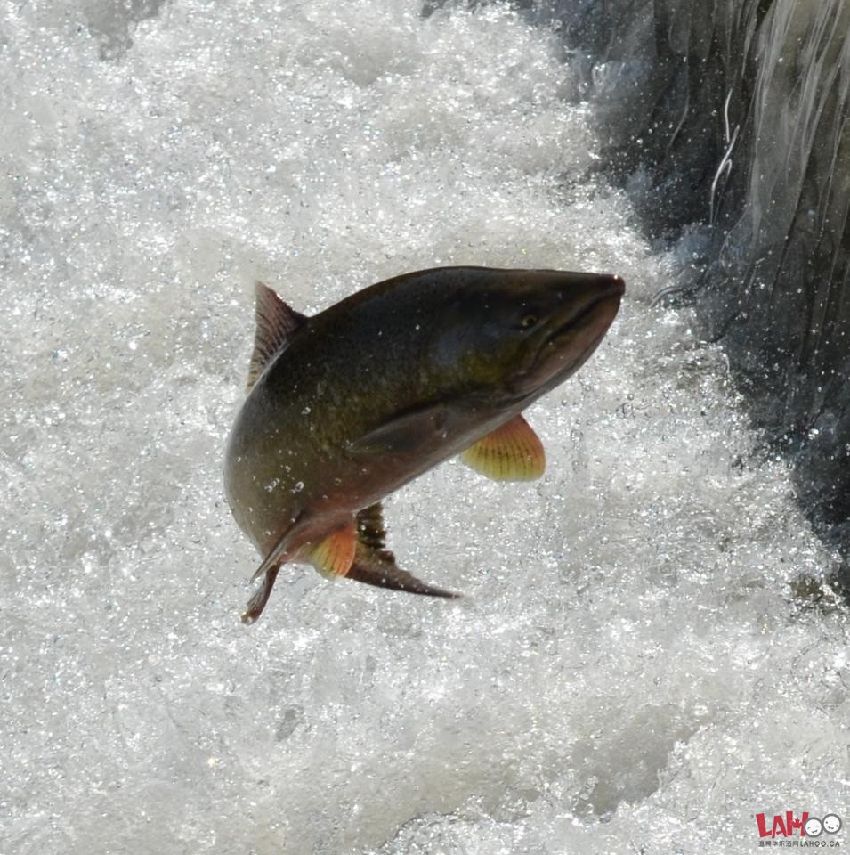 我没见过鲤鱼跳龙门的景象,不过,这次却见识了三文鱼跃龙门。这些三文鱼们倘若跃过石岩立足未稳,或者体力较弱者,就都又会被湍急的水流冲回下游。有些颇具同情心的游客们则会边 看还边着急地大声喊:“往水下扎!往水下扎!”好像三文鱼听懂了他们的指点就不会被水流冲回了似的。在奋力向上的过程中,许多三文鱼被上游的障碍物阻碍,但它 们毫不介意,依然一次又一次积聚体能,一次又一次跃起,直到最后筋疲力尽。我在那里默默地站了很久,用照相机记录着这一幕幕,尤其是那些即将被水流冲回时 的鱼,在水流台阶处全力挣扎的样子,催人泪下。