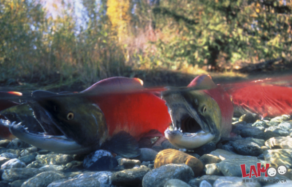 在产卵地区,常常有一些来抢“新娘”的鱼。“新郎”为了保护自己选定的 “妻子”,会忙着和其它挑战者进行争斗;雌鱼为了给自己即将出生的“孩子”准备舒适的摇篮,也不顾身体的劳累,先在河底选好一块有细沙和砾石的地方,然后 迎着水流趴在沙地上,身体剧烈地扭来扭去,用腹鳍和尾鳍把砂石和杂物清扫出去,最后整理出一个比自己身体大得多的椭圆形坑。当雌鱼产下一堆亮晶晶的卵时, 获胜的那些雄鱼们随即也产下精子完成繁殖。此后,雌鱼还需要拖着虚弱的身子,用尾鳍将砂石扫到卵堆上。这个过程要用十多天的功夫,才能把卵盖好。由于雌鱼 的过度疲劳,来不及看到自己的小宝宝出世就将结束生命,而雄鱼也因长期的拼搏,再加上多次的生殖活动,精力已全部耗尽,不久也相继死去。在这个旅程的最 后,雌雄鱼们都已经面目全非。俊美的雄鱼变得背部高高隆起,上下颌弯成腾钩状,牙齿也变得又大又长。苗条的雌鱼也变得大腹便便。看着那些体型巨大的三文鱼的 尸体,我不禁慨叹造物主的安排。这是三文鱼一生最后的使命,并愿意为这个使命付出生命!