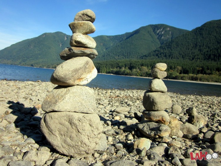 岸边有许多石头。我之前见过有一人能把几大块石头摞在一起,而且支撑处仅靠一个点,这需要有非常平衡的技巧,甚至比把鸡蛋立起来还要难。关于在海边堆石头,还有传说典故的。最早是当地的印第安人为悼念出海未归的亲人,就在海边把石头堆起来,有几位亲人未归,就摆几个石头。这是一种祭祀活动。