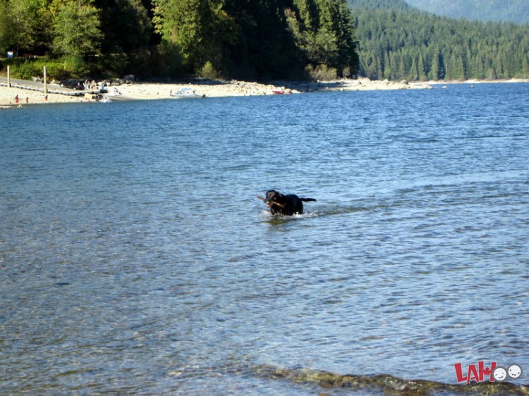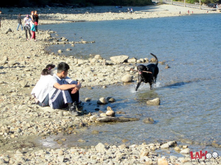 几个训狗的老外也是结伴来此,主人把飞盘等物品远远地抛向水中,狗狗循着目标冲进水中,叼回飞盘再游回来。主人和狗都玩得很开心,我们在一旁看训狗表演也很开心。