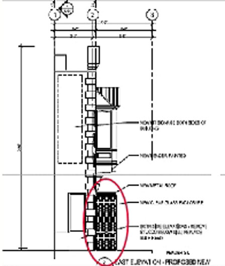 由玻璃及金属屋顶隔开的空间(红圈)侧面图。 (市府申请文件)
