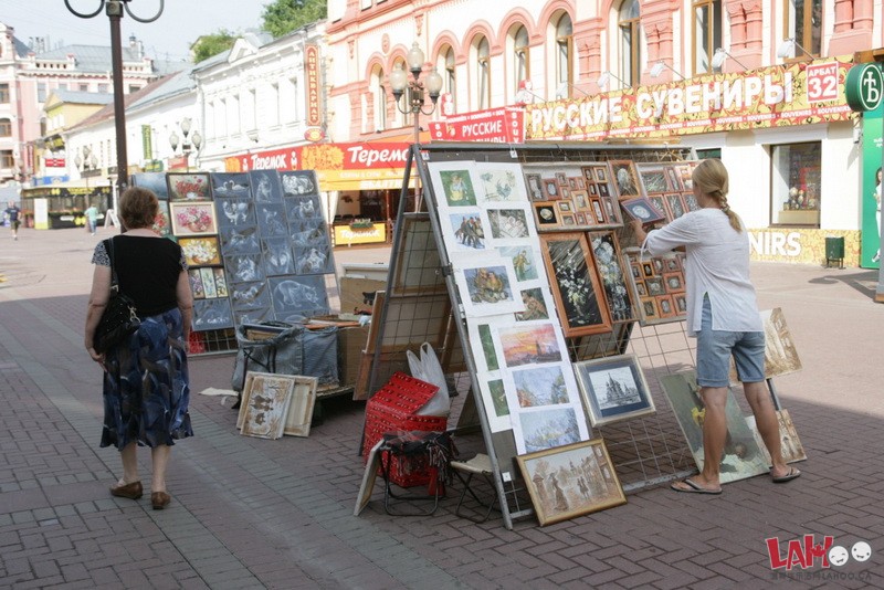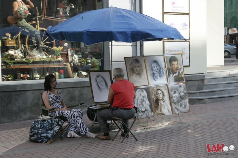 最招人的是街边的商摊,小贩们把商品摆出招揽顾客,但没有北京的大声叫喊。这里的小贩很多是老人,非常愿意和人搭讪,几乎都会说几句汉语,很友善。这里有很多画摊,摆着各色的风景、肖像画,有版画,水粉画,素描,最多的是油画。都说俄罗斯人热爱艺术,不知这里有多少画家,几乎到处都能看到画贩。