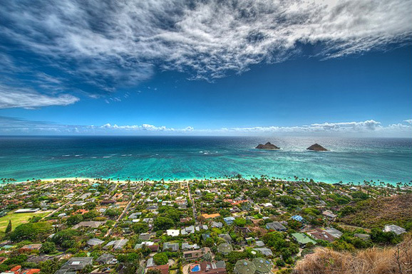 波光粼粼的海水,纯净白色的沙滩,风姿摇曳的棕榈树,郁郁葱葱的热带植物,无尽的阳光共同构成了夏威夷风景最优美的Lanikai海滩。因为海岸附近珊瑚礁的保护,所以这里也是冲浪爱好者的天堂,深绿色的海水在阳光的照射下反射出耀眼的光芒,犹如定格在明信片上的风景一般美丽。
