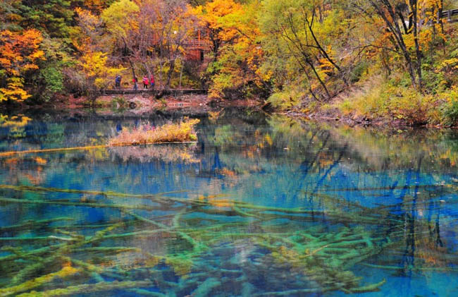五花海 :有“九寨沟一绝”和“九寨精华”之誉的五花海,位于中国九寨沟国家公园。四周的山坡,入秋后便笼罩在一片绚丽的秋色中,色彩丰富,姿态万千,独霸九寨。五花海的彩叶大半集中在出水口附近的湖畔,一株株彩叶交织成锦,如火焰流金。