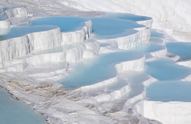 棉花堡(Pamukkale):棉花堡位于土耳其Denizli市的西南部,是远近闻名的温泉度假胜地,此地不仅有上千年的天然温泉,更有这种古怪的好似棉花一样的山丘。大自然的鬼斧神工制造出了如此美妙的仙境。关注微信“大海、旅游、人”