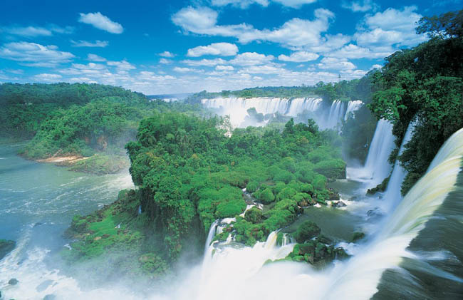 伊瓜苏大瀑布:伊瓜苏大瀑布是世界上最宽的瀑布,位于阿根廷与巴西边界上伊瓜苏河与巴拉那河合流点上游23公里处,为马蹄形瀑布,高82米,宽4公里。1984年,被联合国教科文组织列为世界自然遗产。