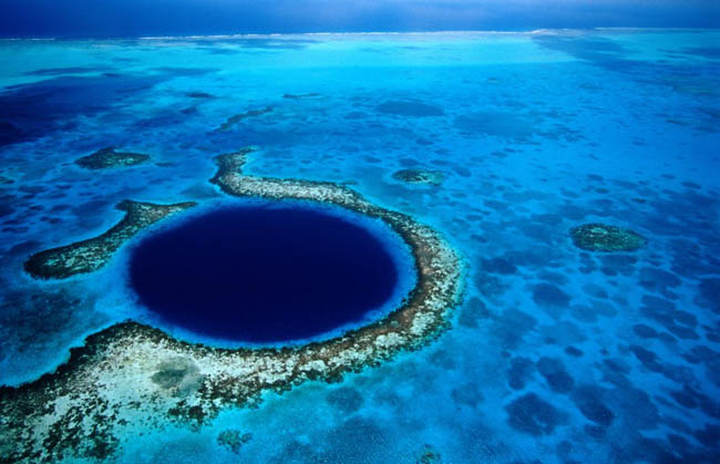 大蓝洞 (Great Blue Hole):大蓝洞为一石灰岩洞、全世界最大的水下洞穴,位于伯利兹外海96.5公里的大巴哈马浅滩的海底高原边缘的灯塔暗礁。