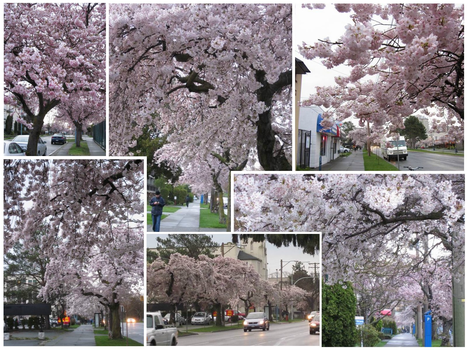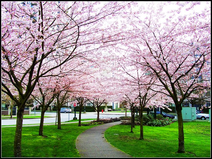 史丹利公园、卑诗大学校园、太平洋精神公园(Pacific Spirit Park)、本那比山公园以及西区的不少住宅区,都能看到无比美丽的樱花盛开景象。而在如格兰湖岛(Granville Island)、Burrard Skytrain Station等一些充满都市气息的热闹场所,也能看到一树树肆意开放的樱花,渲染出喧嚣中的浪漫。