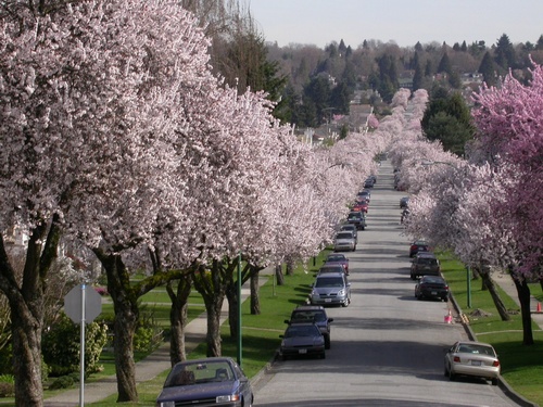 温哥华市的莱丽园社区(Riley Park Community),有一片面积较大的樱花种植密集地,该社区靠近伊丽莎白女王公园,位于Cambie以东,Fraser以西,12th Ave以南,41th Ave以北。