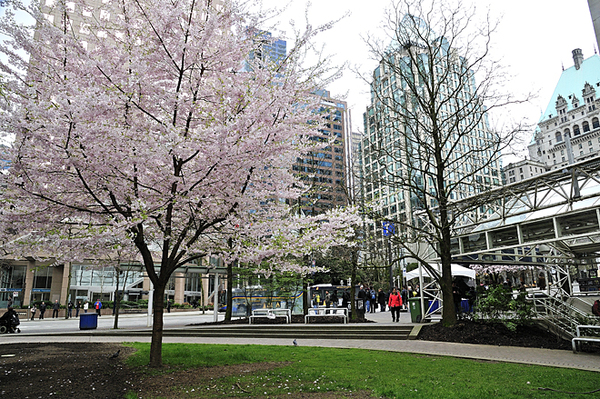 Downtown的Burrard Skytrain Station一出口,周围就有大片的樱花树,品种都是东京樱(Yoshino)。盛开时节,冠樱如雪,非常美丽。车站周围皆是高楼大厦,平日人来人往,都市气息浓厚,让赏樱变成一种特别的感受。