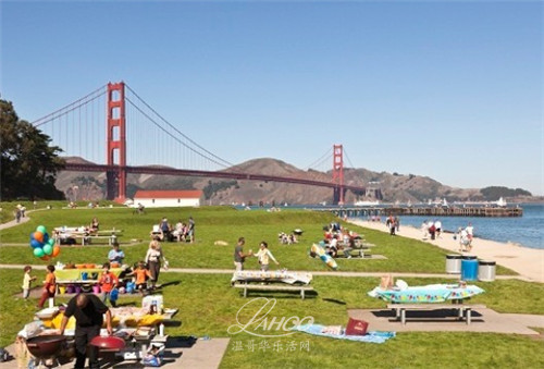 旧金山最著名的社区公园,这里可以以旧金山最显著的一排维多利亚式居民建筑(当地人称painted ladies)为前景,眺望旧金山的城市天际线。(下图)