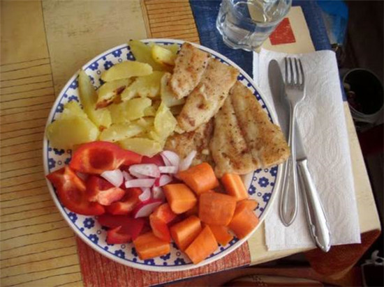 红萝卜、樱桃萝卜、彩椒、马铃薯、番茄,加上鱼肉、面包和水果,虽然基本都不是热菜,但是搭配起来有种健康的感觉。