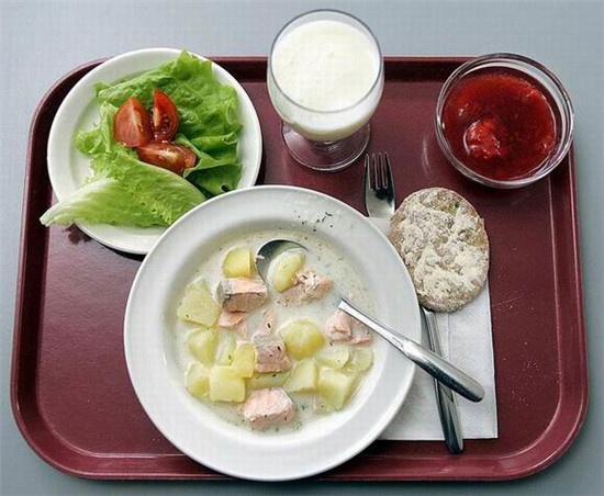 芬兰大学饭堂的餐食看起来很有食欲,荤素搭配得非常好,主菜有奶油汁马铃薯炖三文鱼,好像很好吃呢!