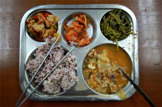 酱汤、泡菜是韩国学校饭堂中最最不可缺少的菜式,以粗粮饭为主,另外还会有年糕、辣萝卜及凉拌菜等吃韩国料理时常见的餐前小吃。食材丰富,整体营养搭配得比较均衡。