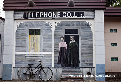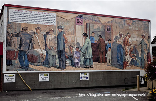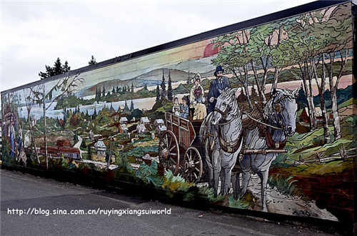 不知是谁第一个想出来在墙上作画,和墙一样高的壁画很富装饰性,于是很多人都来用画装饰墙面,市长认为这是一个挽救小城的好办法,就请来艺术家来作画,画的是小镇的历史,早期的开矿工人,原住民的生活,还有一幅描写中国早期筑路工人的壁画。