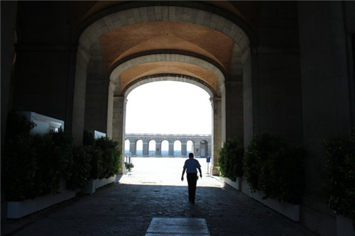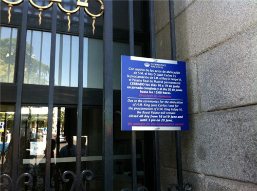 皇宫东侧的“太子门”门前,悬挂着一则告示:因举行卡洛斯一世向费利佩六世传位仪式,皇宫自6月16日早至20日下午3点前谢绝参观。