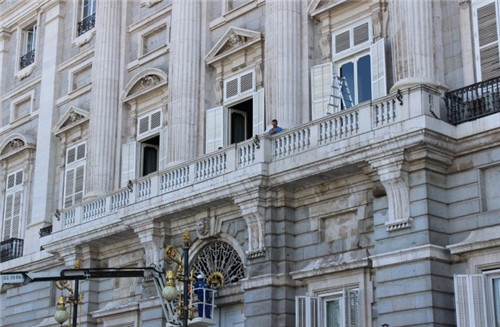 皇宫东侧、正对着东方广场一面,有人正架着梯子擦玻璃。典礼当日,新国王将站在这座阳台上向群众挥手。顺便说一句,皇宫看上去可够脏的啊,平时怎么保养的!
