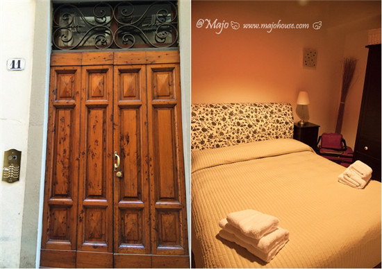 我们的公寓在Borgo Santa Croce,算是他家最小的公寓类型了。在古老安静的小巷内,公寓大门非常有感觉。一卧一厅带厨房的套房在顶楼四层,没有电梯。很辛苦的要搬行李爬楼梯。房间内的基本设施都有,装修走家庭温馨风格;浴室比较小,还不如我家我自己浴室的1/3大。不过毕竟几百年的老房子,我们不能要求它和现代房子一样。