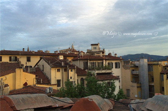 隔天,很早的不到6点就醒来。其实天已经比较亮,而且外面有很多鸟叫声。我走到客厅外的露台,又顺着小阶梯爬上了房顶。红顶们都在我周围,仔细一看,百花教堂的大圆顶,也在不远处露出尖尖角。暌别十年的佛罗伦萨天空,晴朗带云。站在只属于我的屋顶上,我忍不住上弯了嘴角~~