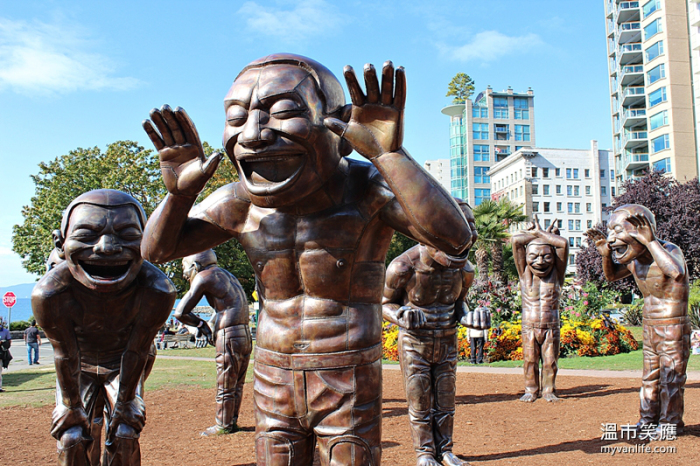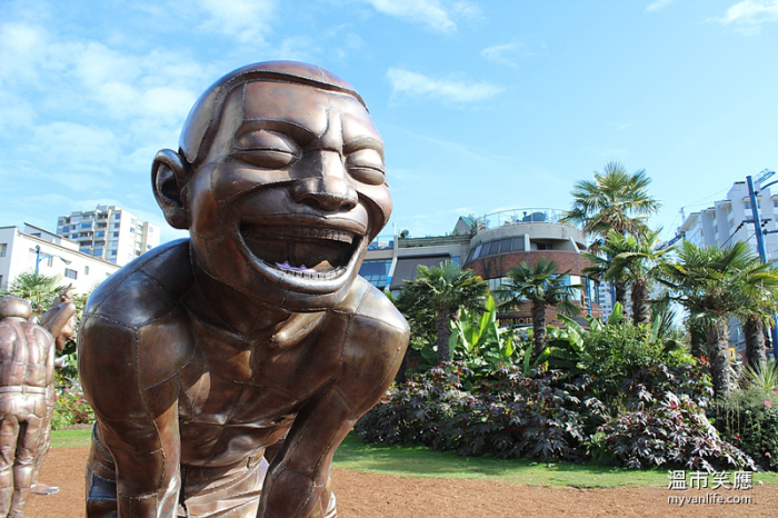14 个2.5公尺高的大头仔们,咧开大嘴,眯着眼睛,做出各种动作搞笑。中国艺术家岳敏君(Yue Minjun)这组让人过目不忘的红铜雕像,在温哥华英吉利湾笑脸迎人。原本只是2009年温哥华双年展(Vancouver Biennale)短期的展作,没想到受到温哥华市民欢迎的程度超过预期,展期结束后由民间企业买下,长期驻放在西尾区(West End)人来人往的临海街边,成为温哥华市拍照景点第一名。