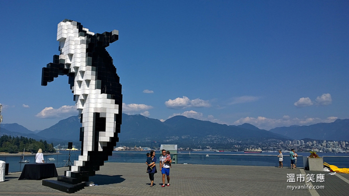 在Vancouver Convention Centre的另一头,也是冬季奥运圣火的所在地,一头杀人鲸自水面腾跳而出,仰天翻转,凝身成永恒。由加拿大作家兼艺术创作者Douglas Coupland所设计的这雕塑是由大小划一的黑白方块组成,像是画数太低的图档,线条呈现锯齿状。远观是条鱼,近看是积木,充满童趣的风格令人会心一笑。