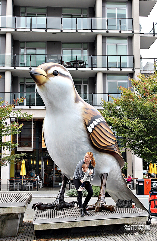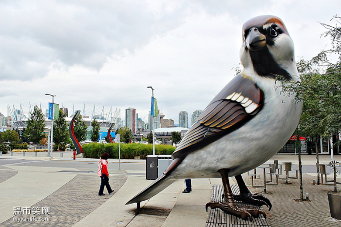 小心!格列佛大人国游记里的鸟类进攻温哥华!在为冬季奥运而建的奥运村的广场上,两只三层楼高的麻雀站在公寓大楼间,侧耳倾听。人们在麻雀的注视下野餐休憩,妈妈带小孩学步,偶尔还抱着小孩摸摸巨大的鸟爪。鸟儿们的形色太逼真,当鸟眼定定地看着你,被希区考克电影里邪恶乌鸦凝视的压迫感油然而生。