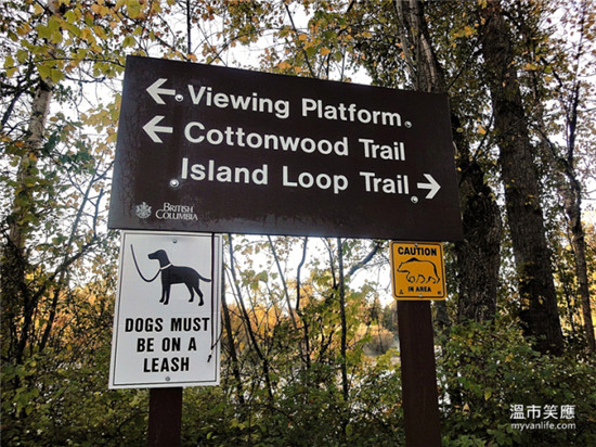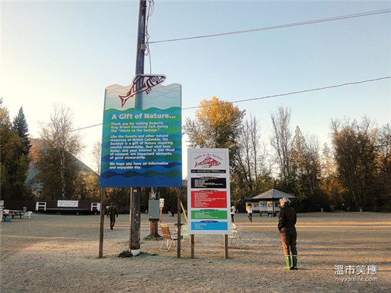 前一晚借宿鲑鱼湾,隔天东方微亮即启程前往“鲑鱼礼赞”现场。不到七点钟,立起大型看板的停车场已有零星车辆,游客三三两两顺着工作人员的指示进入河边。毕竟地属野生栖地,树上看板提醒游客注意郊狼和熊只的出没。