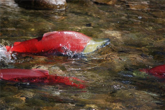 邻近交配阶段,此时的鲑鱼大多两两相近,一公一母在水里并肩顺着水波悠游。如果你走近仔细观察,会发现洄游至此的母红鲑(sockeye)遍体艳红,头嘴呈鞋把钩状,龇牙裂嘴,好不丑陋。两个月前她们的长相可没这般狰狞 – 原本银灰圆滚的身躯,脂肪在漫长的旅程消耗殆尽,不但身材变形,体色也转变成显目的赤艳。这颜色提高了失却生命的风险 – 在天上的老鹰、陆上的熊以及人类等捕猎者的眼中,鲜红的鲑鱼更无所遁形。