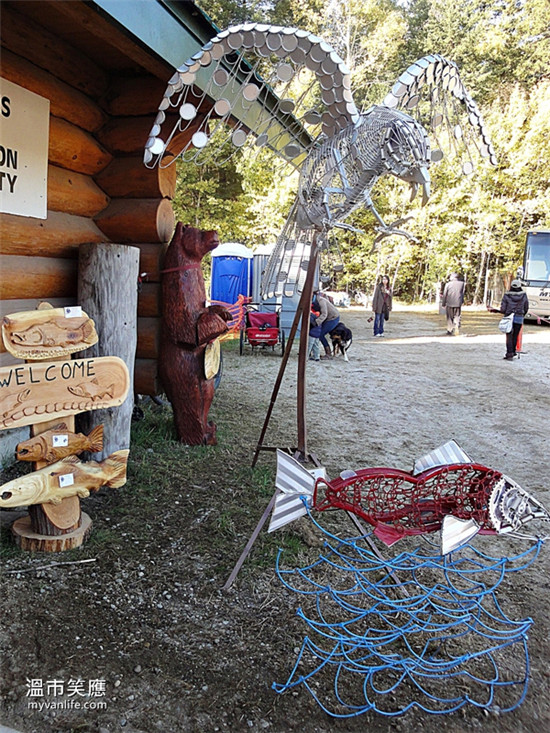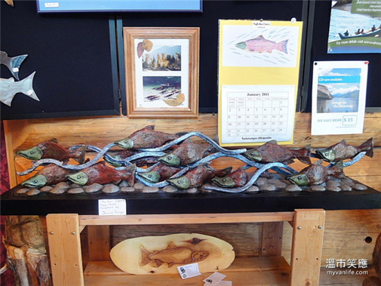 从悲伤气氛弥漫的河边散步回到活动展览小木屋,鲜艳的鲑鱼雕塑和画作令人有种恍如隔世的感觉。这场史诗般的生命传承惊天动地进行着,却又是如此无声低调。