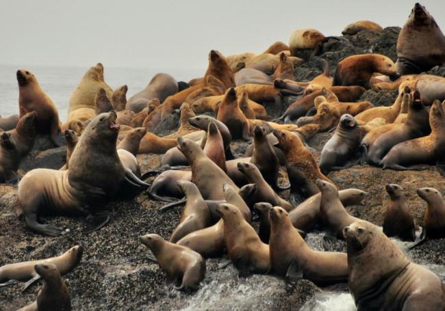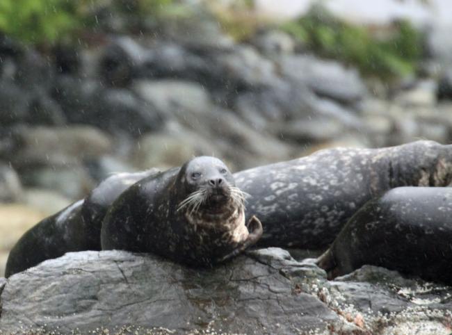 你可以在Tofino镇上或酒店的前台预订观鲸鱼的船,我们订的是可容纳46名游客的大船,船上为游客免费提供热巧克力、茶水饮料,在航海期间,船员还手持鲸鱼模型给游客做一些科普性质的讲解。一路上我们看到了海狮、海豹,当然也看到了鲸鱼。