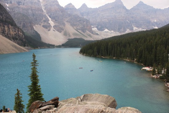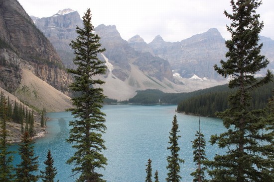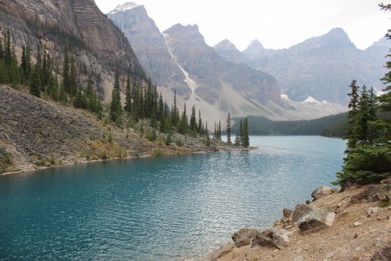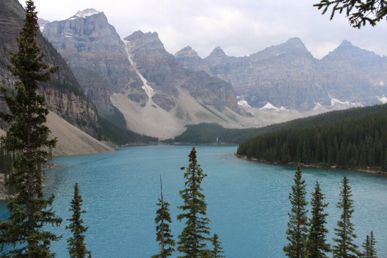 图15: “梦莲湖”(Moraine Lake)这个中文译名很美,令人浮想联翩。其实“Moraine Lake”的英文原意就是“冰碛湖”的意思,是个纯地质名词。梦莲湖的颜色如蓝宝石般漂亮,可惜的是,我们赶到这里时天忽然阴了下来,灰云映照下的湖水,颜色已经比阳光下逊色了很多。