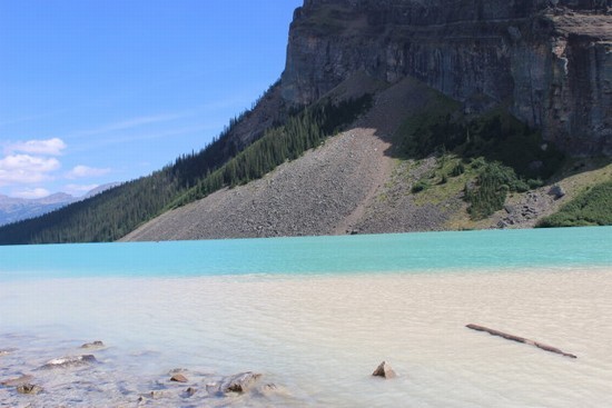 图11:在路易斯湖尽头,深水与浅水颜色分明。其实路易斯湖这种漂亮的颜色是冰川融湖的典型特征。因为冰川的运动,被冰川碾压成粉状的岩石物质被融化的冰水带进湖里,在阳光的照射下,因水的深浅不同,就会呈现黄、绿、蓝等各种美丽的颜色。