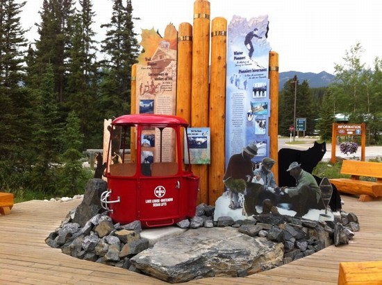 图19:路易斯湖游客信息中心外的景观造型。离开梦莲湖,沿Mornaine Lake Rd北行回到Lake Louise Dr,再顺路东行回到1号公路与Lake Louise Dr交叉口处的“路易斯湖村”(Lake Louise Village)。这里是路易斯湖及梦莲湖游览区的游客集散中心,有商场、超市、餐厅、游客信息中心,以及大型的停车场。