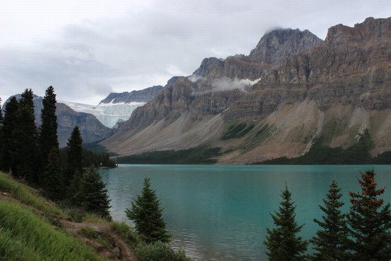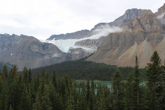 图4:站在弓湖这里回望,可以再次看到我们刚才去过的Crowfoot 冰川。弓湖很漂亮,不逊于昨天我们去过的路易斯湖和梦莲湖,但与那两座名湖熙熙攘攘的“盛况”相比,这里冷清得令人难以置信,除了我们之外,再无一个游人。