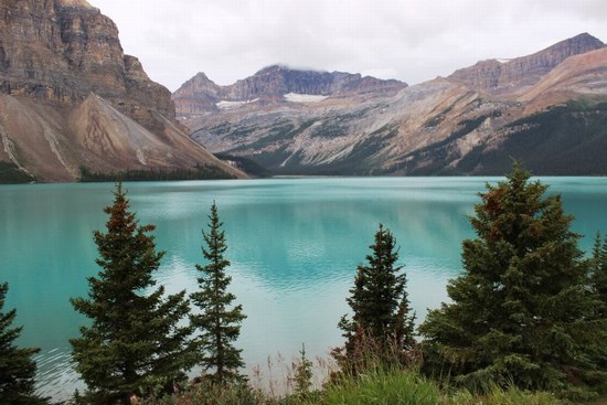 图3:离开Crowfoot 冰川,刚前行不远,便又看到了路边的景点标志牌。下车一看,一座漂亮的绿湖出现在眼前。这是“弓湖”(Bow Lake),也被音译为“鲍湖”,前面介绍班夫镇时曾提到的“弓河”,河水就是从这座湖流时流出去的。