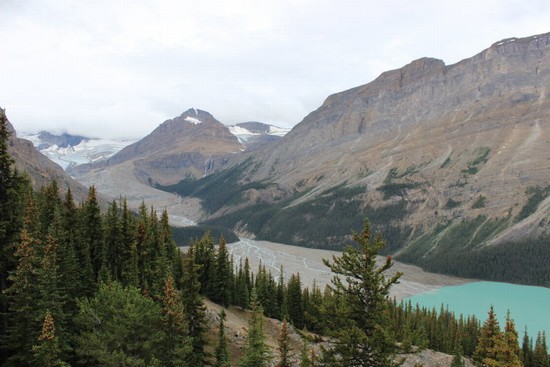 图6:佩托湖不在冰原大道路边,把车停在路边的停车场后要走上一小段山路,才可以居高临下看到形似狗头的佩托湖。从这张照片里,可以清楚地看到颜色如此之美的冰川融湖是怎么形成的:冰川运动,将岩石碾压成粉,融化的冰水将岩粉带入湖中,湖水在光线的折射下呈现出漂亮的颜色。