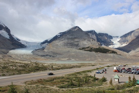 图13:对多数游客来说,徒步上冰川是个即累又险的活儿,那么乘车上冰川就是最佳选择了。乘车上冰川分为两步,首先在哥伦比亚冰原探索中心购票,然后乘坐普通大巴上山(图中远外的上山小道)。