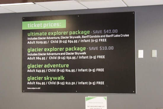 图10:哥伦比亚冰原探索中心提供两项在班夫国家公园中非常著名的旅游项目:冰川探险和冰川空中散步。这个价目牌上清楚地标明了有关价格:单玩儿冰川探险是每人49.95加元;单玩儿空中散步是24.95加元;两项都玩儿是64.95加元;此地两项再加上班夫两项(硫磺山缆车和班夫湖游船)打包价是109.95加元。