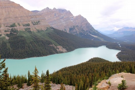 图5:告别漂亮但冷清的弓湖后,我们继续前行。接下来我们要造访的,是班夫国家公园中的另一座名湖——佩托湖(Peyto Lake)。这个湖还有一个外号,叫“狗头湖”,看湖的形状,像不像一只挺着长脖子的大狗?