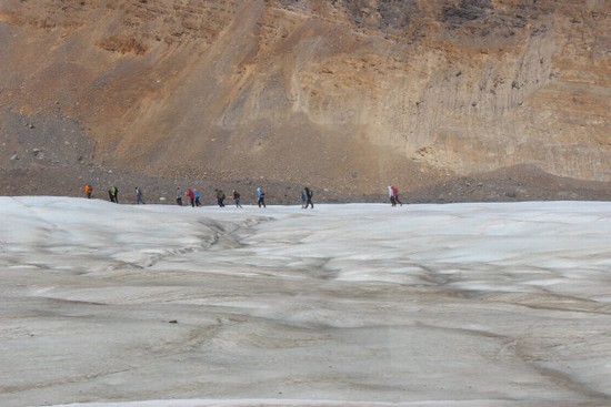 图12:一队游客徒步走在阿萨巴斯卡冰川上。冰川与江河、湖泊、森林、、峡谷、瀑布一样,是自然界中的一种自然景观,但是江河、湖泊那些几乎人人都见过,可是亲眼见过冰川的人就少多了,而有机会站到冰川上面的,就少之更少。