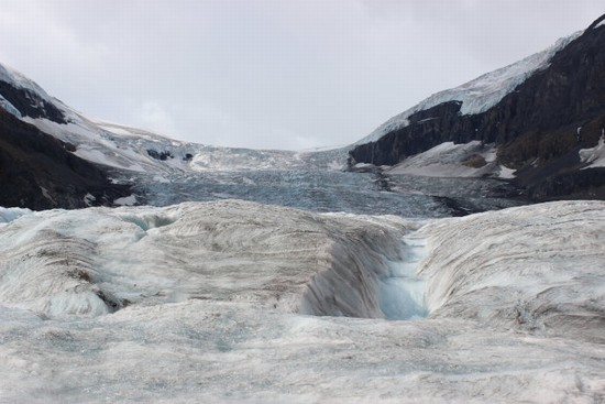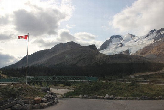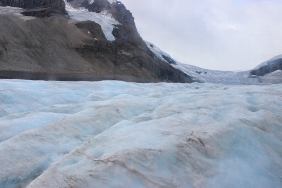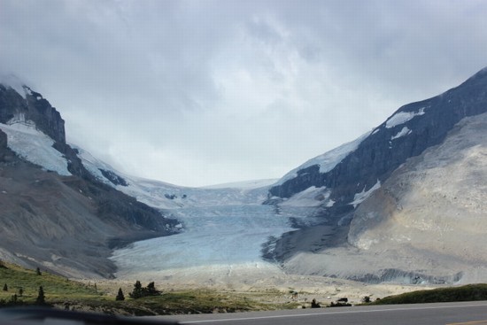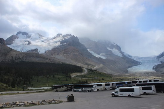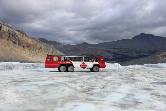 图11:所谓的“冰川空中散步”,是在悬崖边上探出去的一个环型悬空玻璃步道,因为时间问题,我们放弃了那个项目,只选择了“冰川探险”。所谓“冰川探险”,就是乘坐特制的大轱辘巴士“冰川探险家”(Ice Explorer)直接开到图中的这个“阿萨巴斯卡冰川”(Athabasca Glacier)上去。
