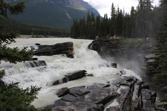 图23:再往前走,93号公路的西侧分出一条岔道——93A公路。从岔道口拐上93A公路,就到了“阿萨巴斯卡瀑布”(Athabasca Falls)。与身姿曼妙的Tangle瀑布不同,这座瀑布气势磅礴,如天河倾泻、奔腾而下。